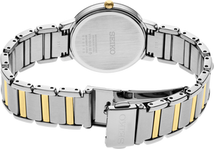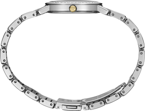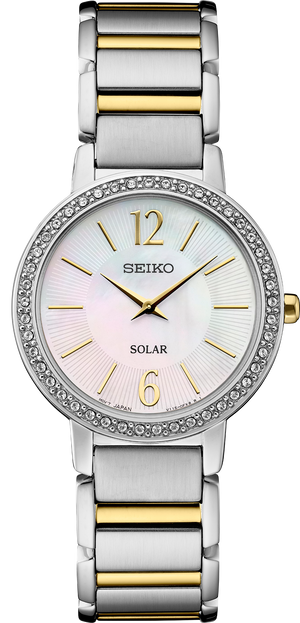 From the Crystal Collection. Unmistakably sparkling, this elegant design from the Crystal Collection features 45 crystals set on the bezel to frame a classic mother-of-pearl dial with gold accents and stylized Arabic numerals. A transparent radial pattern along the stick indices provides subtle dimensionality and richness.