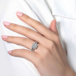 This "JOINED AT THE HEART" designer wedding set is the epitome of two hearts united as one. When worn together as a set, the apex of the heart, on the side of the matching band, will be joined with the rest of the heart on the basket of the engagement ring. This designer wedding set is set with Lafonn's signature Lassaire cle
