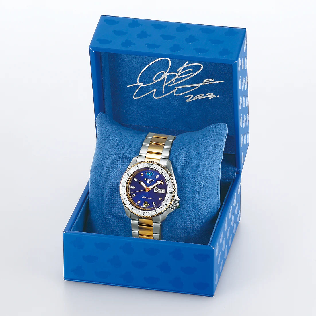 The collaboration watch’s case and bracelet are based on those of the iconic SKX, while the dial is designed without numbers to be "unbounded by time." On the dial, the indexes include COIN PARKING DELIVERY's iconic "Mr. Shirai" at 12 o'clock and "Mr. Katayama" at 6.