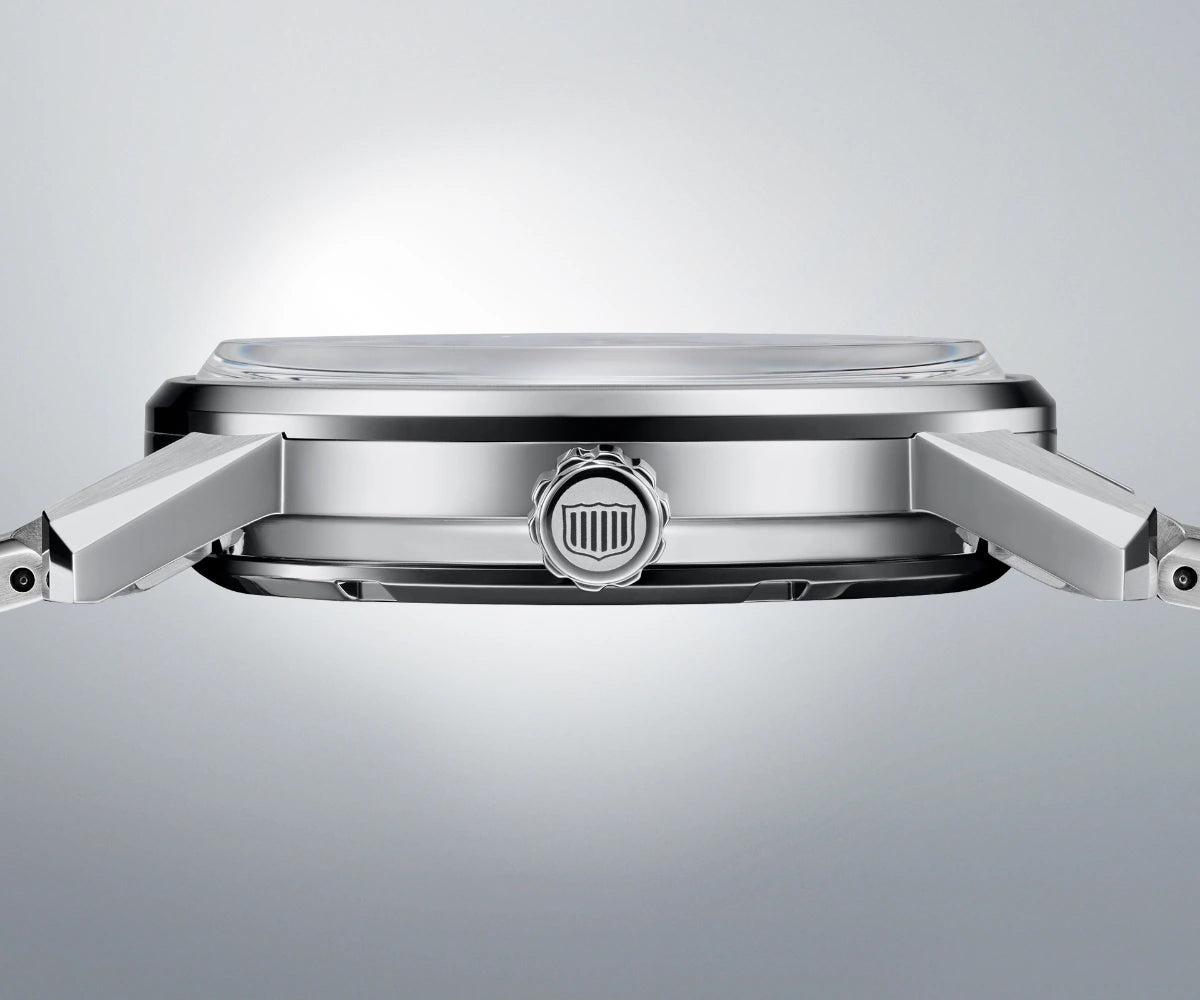 Featuring a combination of a flat, sunray-finished dial with faceted indexes and broad, razor-edged hands, additional modern re-interpretations of the KSK offer a refined and striking presence. The twelve o’clock index is more than twice the width of the others and has a patterned texture specially crafted to ensure high legibility and to give the dial a bright sparkle that invites the eye. The bold, uniquely shaped lugs have sharp angles and wide flat surfaces that showcase both mirror and hairline finishing, creating a sense of precision.