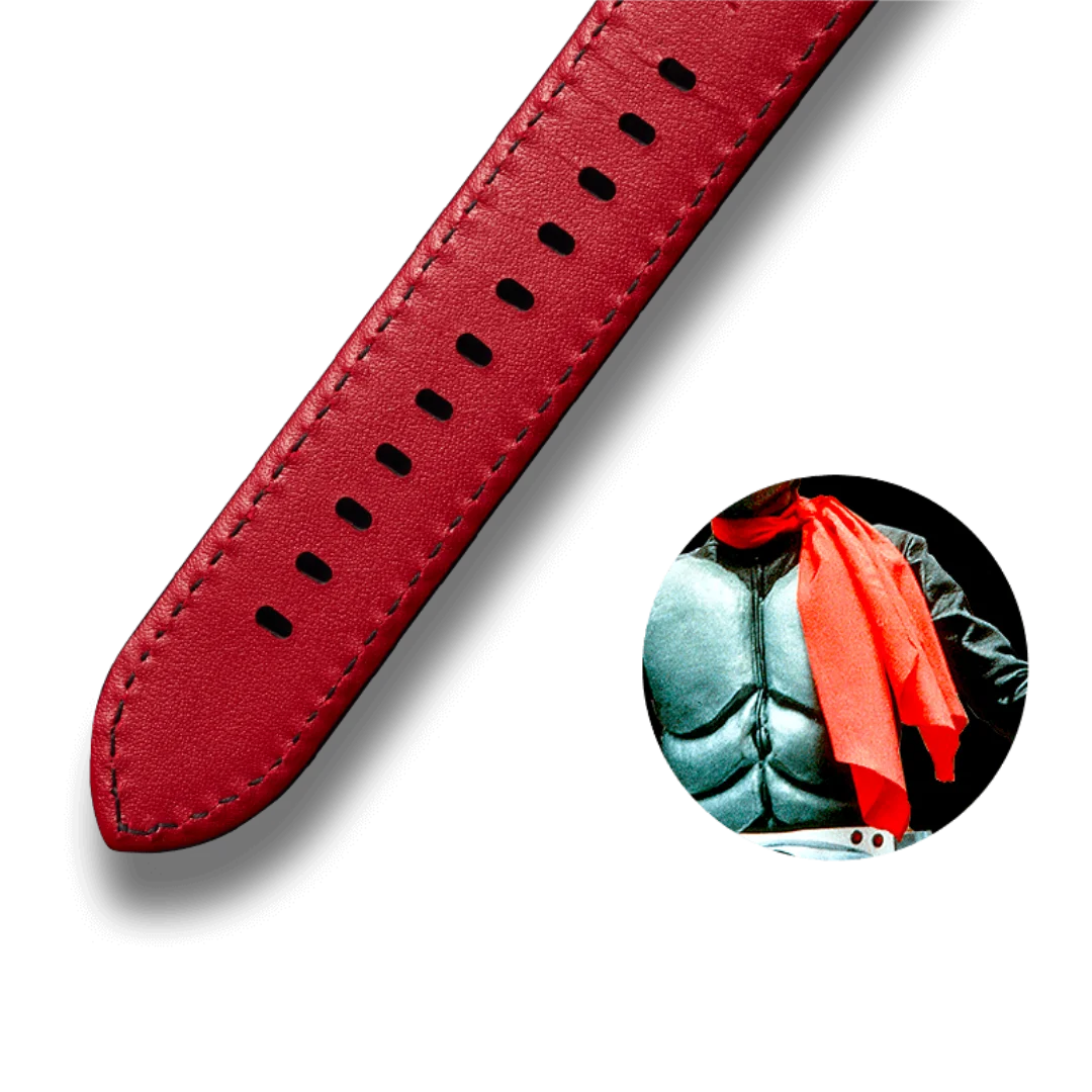 The lining of the calf strap evokes the red scarf that is the trademark of Masked Rider 1.