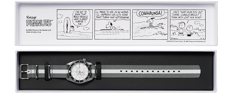 In SRPK25, Snoopy is a surfer who rides the waves, as in the original art. The surfboard on the dial is an original Seiko 5 Sports design, lending the watch a unique feel that only the collaboration can achieve.