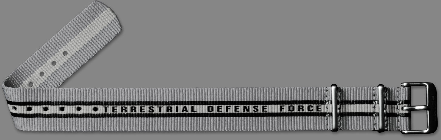 The strap is made of nylon material. It is specially designed with the Ultra Guard's uniform colors and is marked with the words "Terrestrial Defense Force".