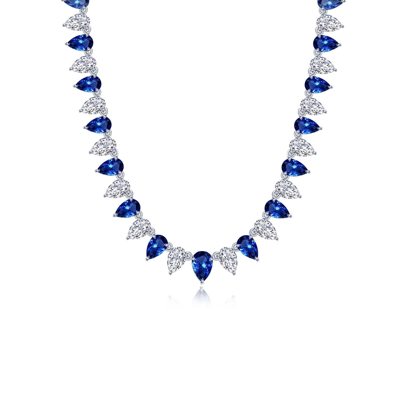 A stunning regal statement. This shimmering alternating tennis choker necklace is set with pear-shaped fancy lab-grown blue sapphires and Lafonn's signature Lassaire graduated simulated diamonds in sterling silver bonded with platinum. Lab-grown sapphires have the exact same chemical, mineral, and optical properties as natura