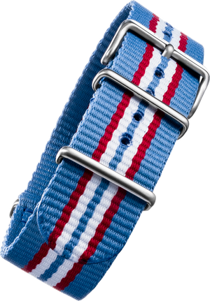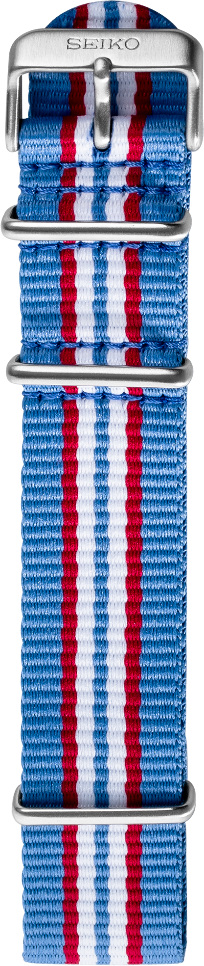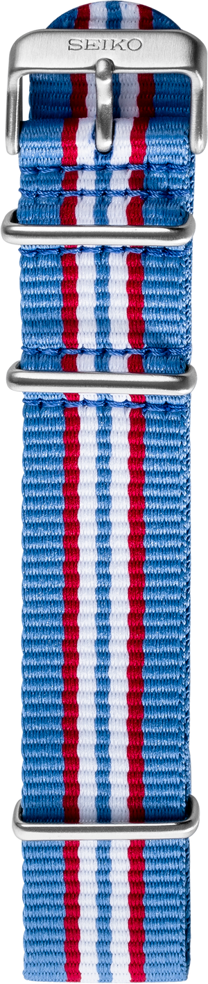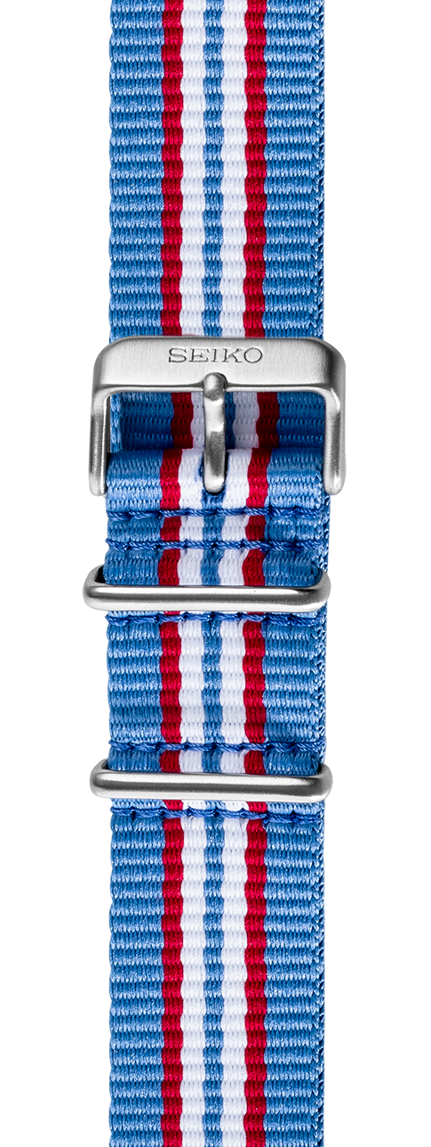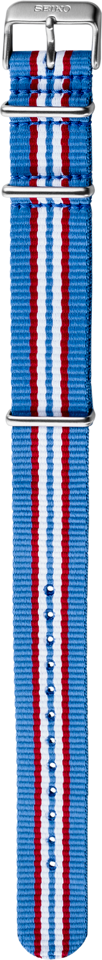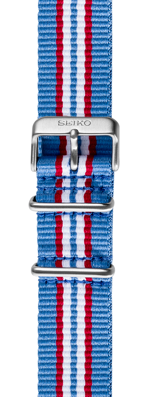 Seiko 5 Sports nylon strap See list of compatible models below product details Fits a 22mm lug diameter 7 stripe-Light blue, red, and white Stainless steel buckle and keeper All straps and bracelets must be installed by an Authorized Seiko Retailer