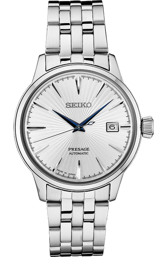 Seiko Presage Automatic. This refine men's watch is designed with a stainless steel case and bracelet. The dial features a white deep, pressed pattern whose shimmering beauty is enhanced by seven layers of gloss finish and the clarity of the box-shaped crystals. The blue hands are delicately curved by skilled craftsmen and