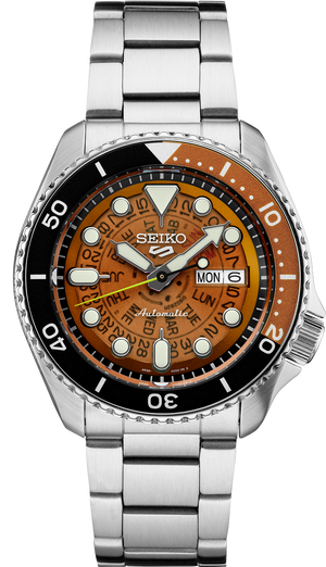 Seiko 5 Sports Collection. A tribute to Seiko's iconic "Time Sonar" of the 1970s, this exceptional watch features a distinctive translucent orange dial offering a view of the day-date disk. Framed by a bi-color uni-directional rotating bezel, the dial also features bold luminous hands and markers, and a contrasting seconds ha