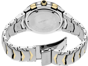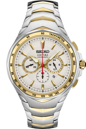 From the Coutura Collection. Delivering the perfect blend of technology and design for those on the move, the Coutura Collection combines bold angularity and shading with superior timekeeping for effortless sport/dress style. Inspired by vintage chronograph design, this dynamic watch is crafted of stainless steel in two-tone