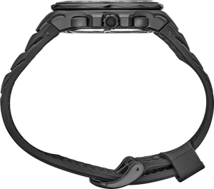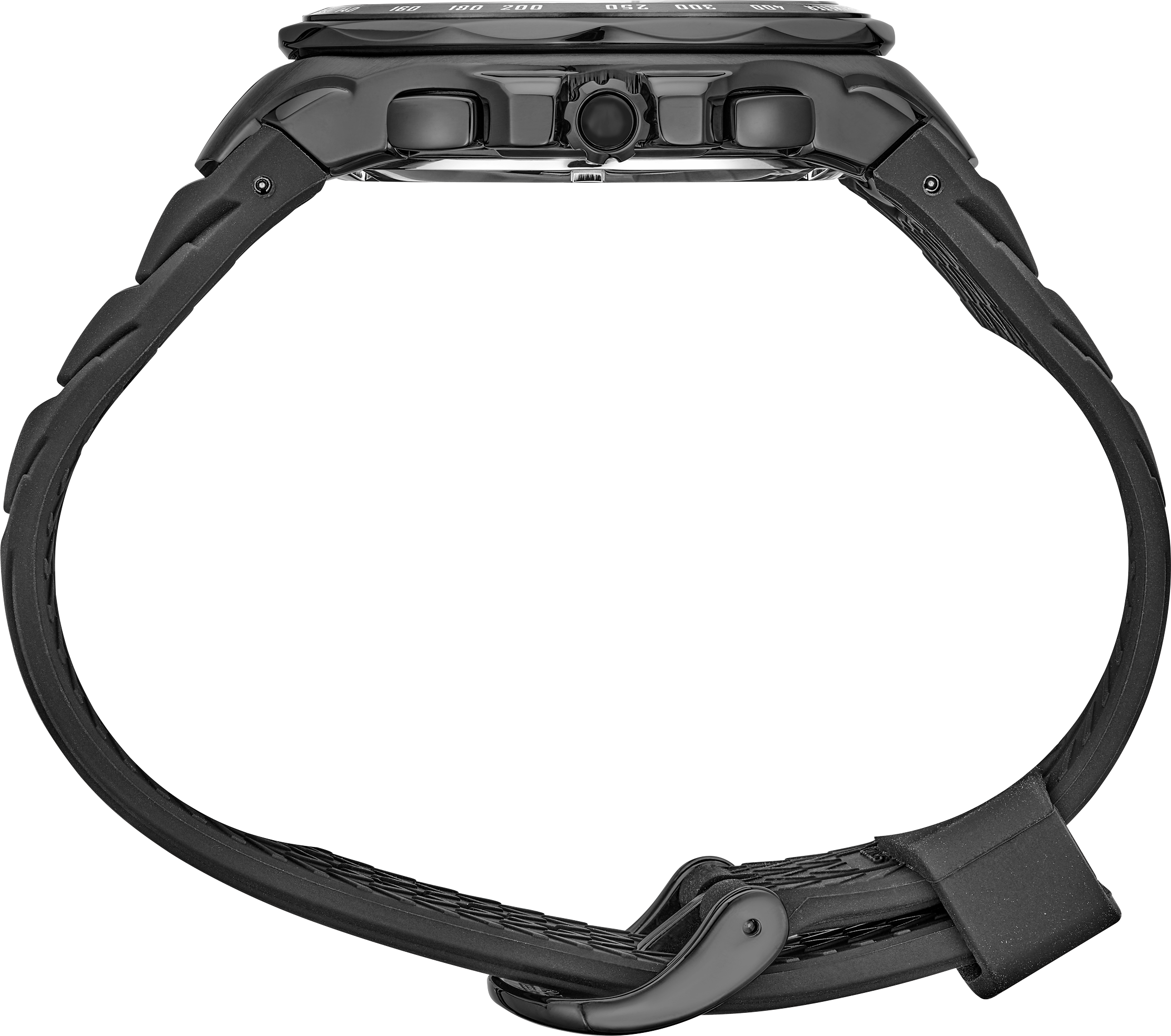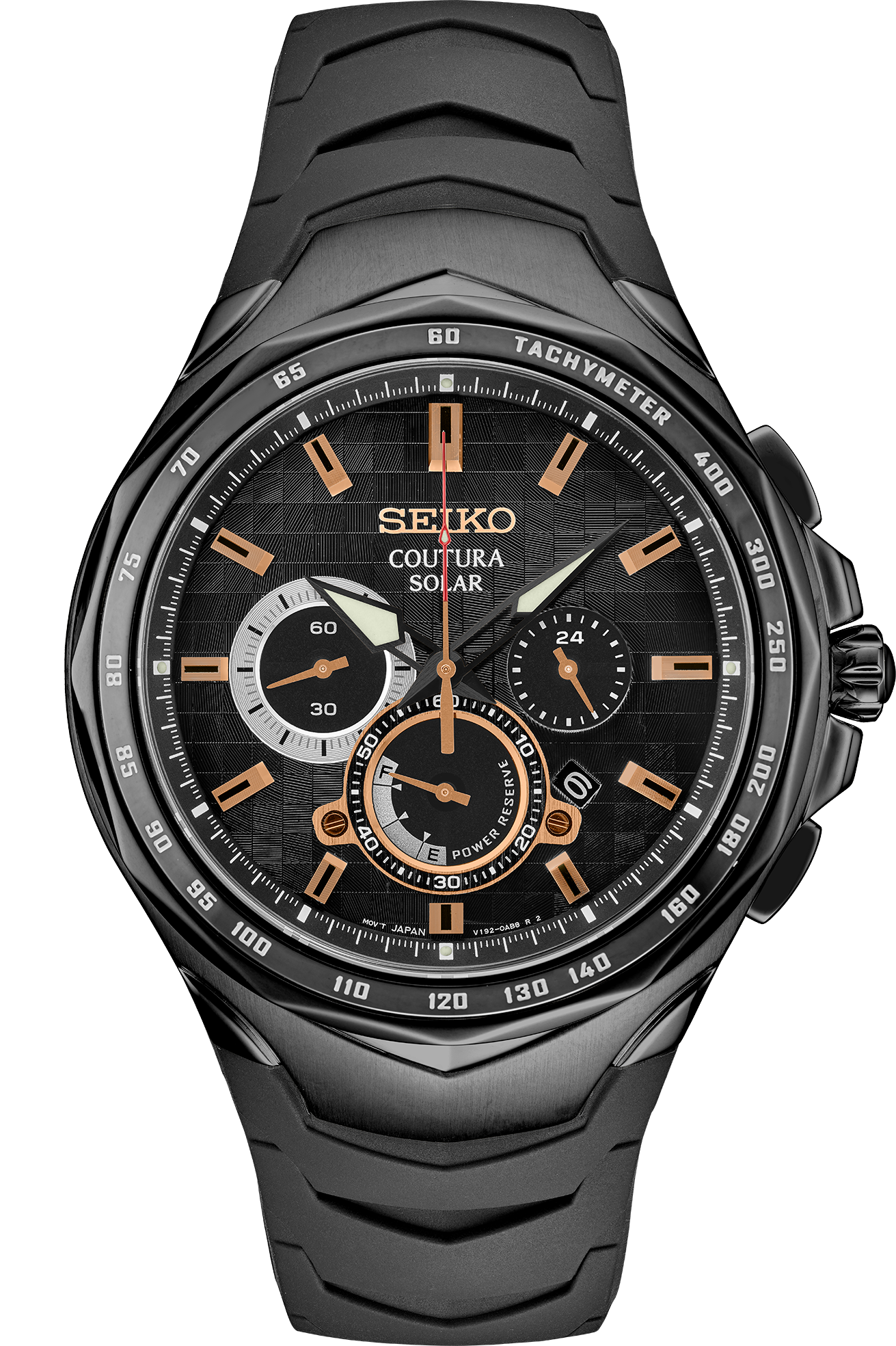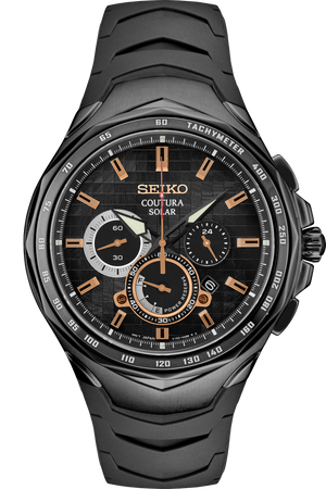 From the Coutura Collection. Delivering the perfect blend of sport and style for those on the move, this boldly distinctive solar chronograph provides effortless timekeeping excellence. Highlighting the dramatic contrast of black and rose gold, this dynamic watch is crafted of stainless steel with black ion finish, screwdown