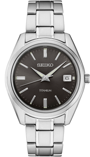 From the Essentials Collection. Offering classic dress/sport designs, the Essentials Collection provides the ideal solution for everyday wear. Crafted of durable and light-weight titanium, this perfectly tailored watch features a contemporary minimalist black sunray dial with date calendar, for a superb blend of clarity and