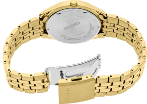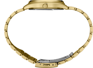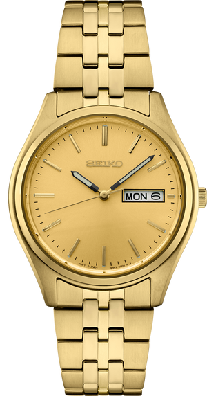 From the Essentials Collection. Offering classic dress/sport designs, the Essentials Collection provides the ideal solution for everyday wear. Crafted of stainless steel in gold-tone finish, this perfectly balanced watch features a champagne sunray dial with day/date calendar and sleek gold stick markers for a superb blend o