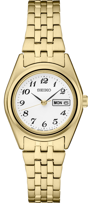 From the Essentials Collection. Offering classic dress/sport designs, the Essentials Collection provides the ideal solution for everyday wear. Crafted of stainless steel in gold-tone finish, this perfectly balanced watch features a white dial with Arabic numerals and day/date calendar for a superb blend of clarity and style.