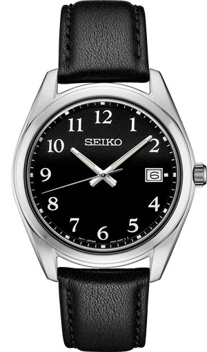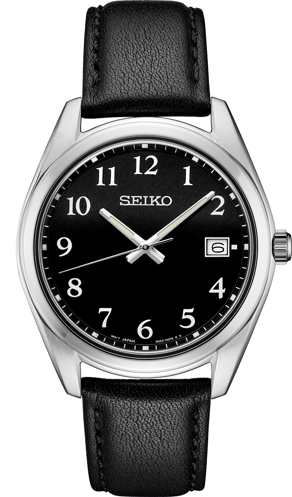 From the Essentials Collection. Offering classic dress/sport design, the Essentials Collection provides the ideal solution for everyday wear. With bold Arabic numerals on a rich black dial, this versatile design features a date calendar and LumiBrite hands. Crafted of stainless steel with scratch-resistant sapphire crystal a