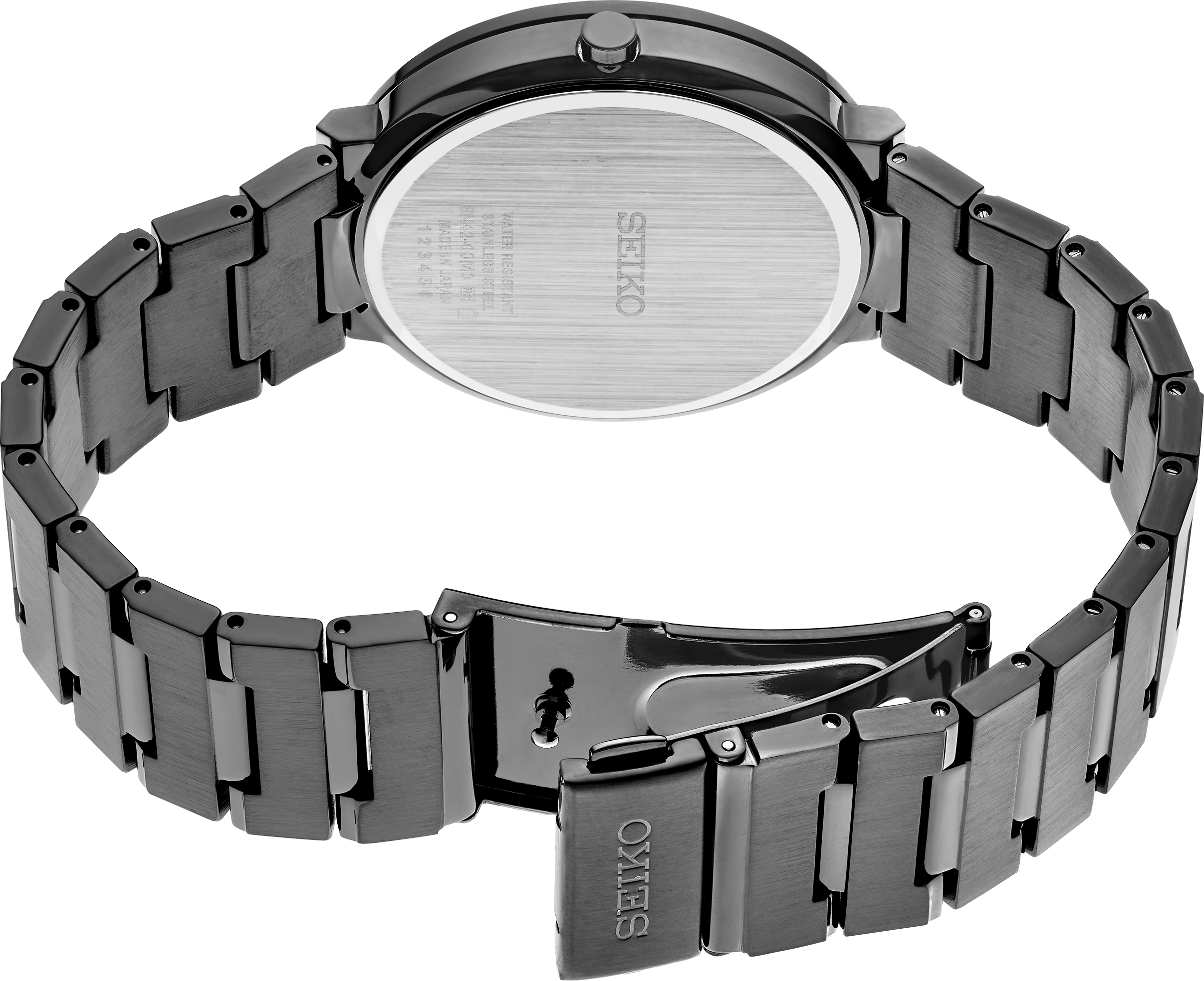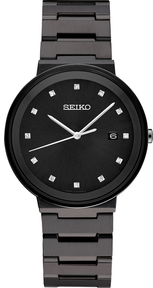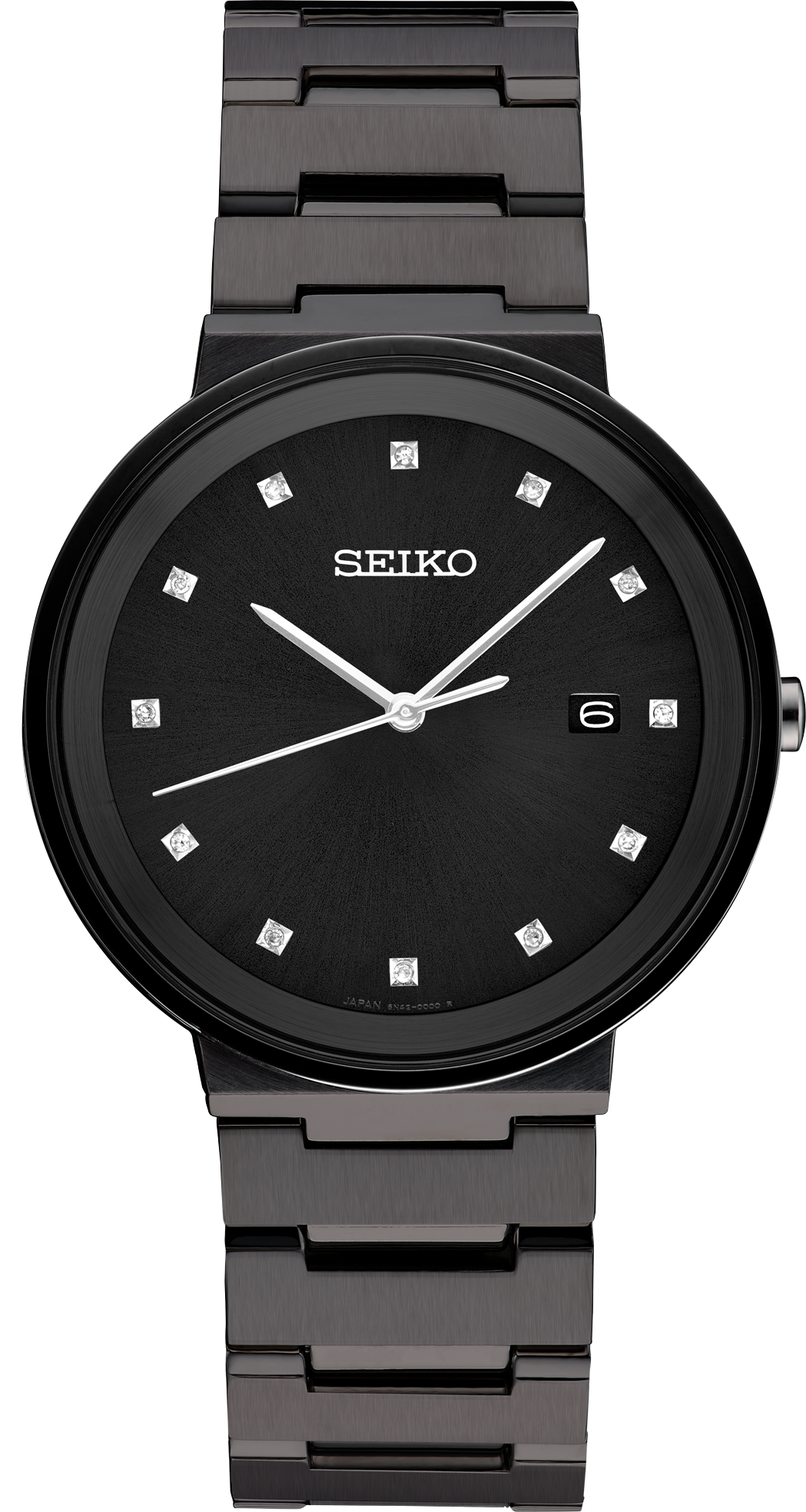 From the Essentials Collection. Offering classic dress/sport design, the Essentials Collection provides the ideal solution for everyday wear. Combining contemporary minimalism with the brilliance of diamonds, this dramatic watch offers a sleek black sunray dial with 12 diamond markers and date calendar, and a slim and comfor