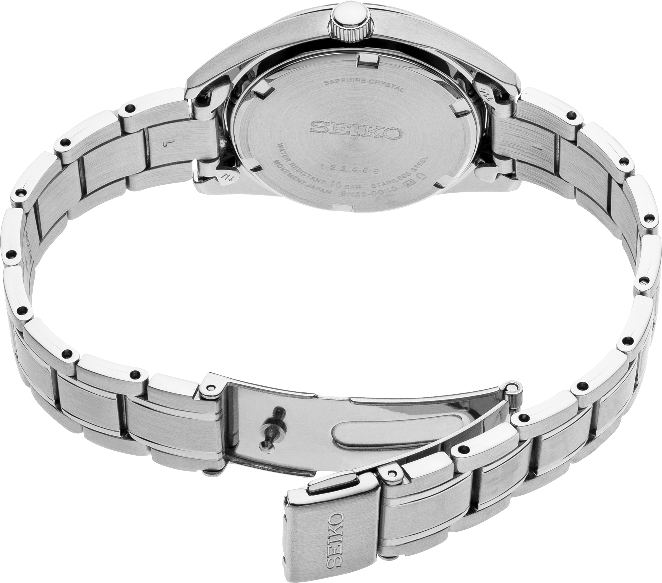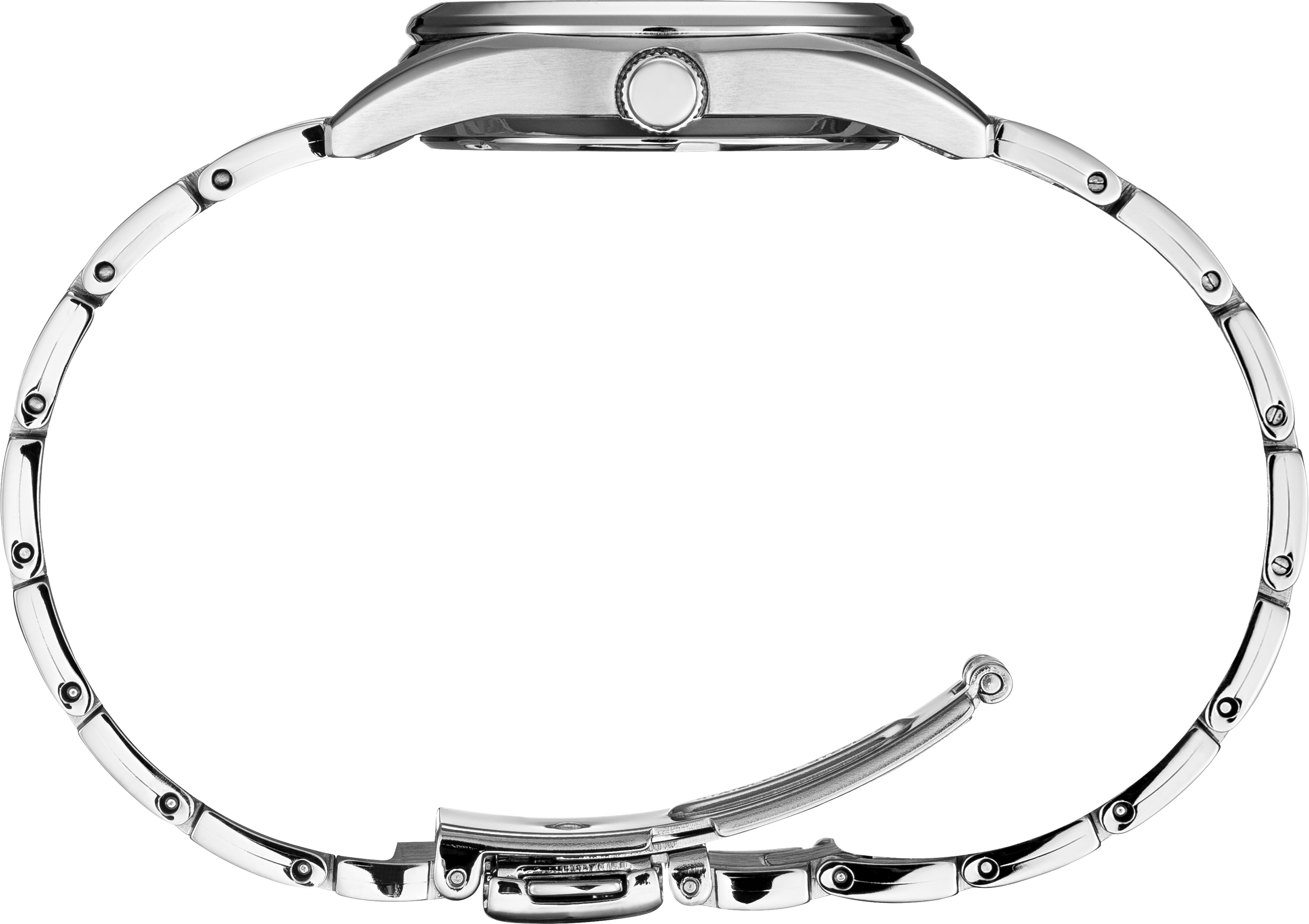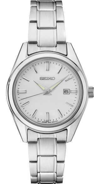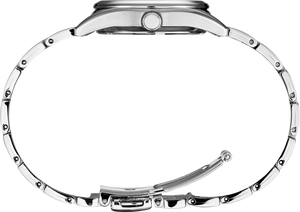 From the Essentials Collection. With classic dress/sport styling, this perfectly tailored design combines sophisticated minimalism with versatility. The silver sunray-finish dial features a date calendar and LumiBrite hands. In stainless steel, with sapphire crystal for superior scratch resistance. 10 bar, 100M Water Resistan