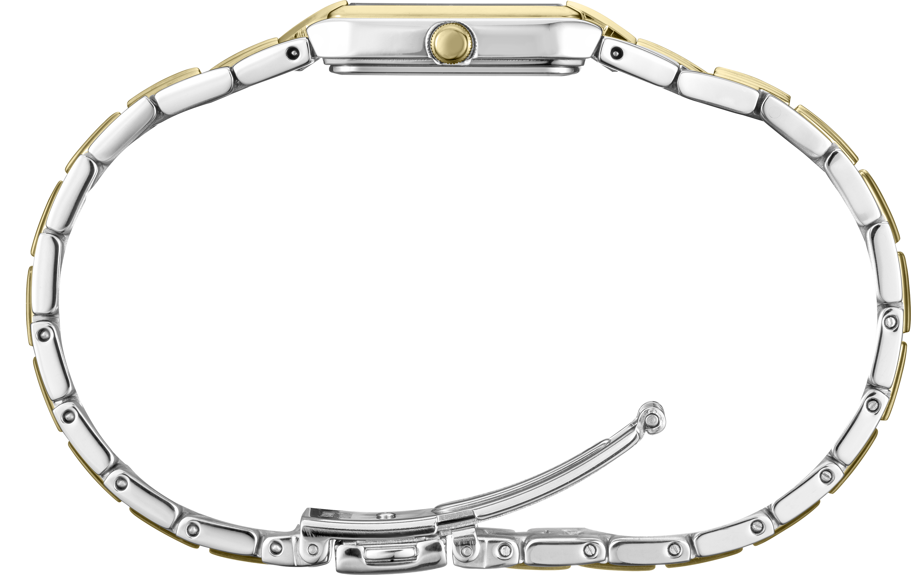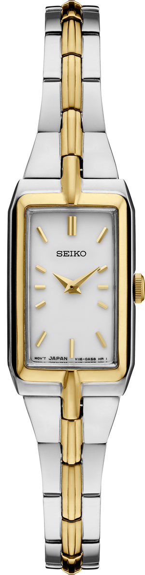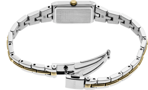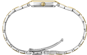 From the Essentials Collection. Inspired by jewelry design, this elegant watch is styled to be perfect for both every day and special occasions. Featuring a white dial with gold accents, this sophisticated timepiece is crafted of stainless steel with two-tone finish. 3 bar, 30M Water Resistant