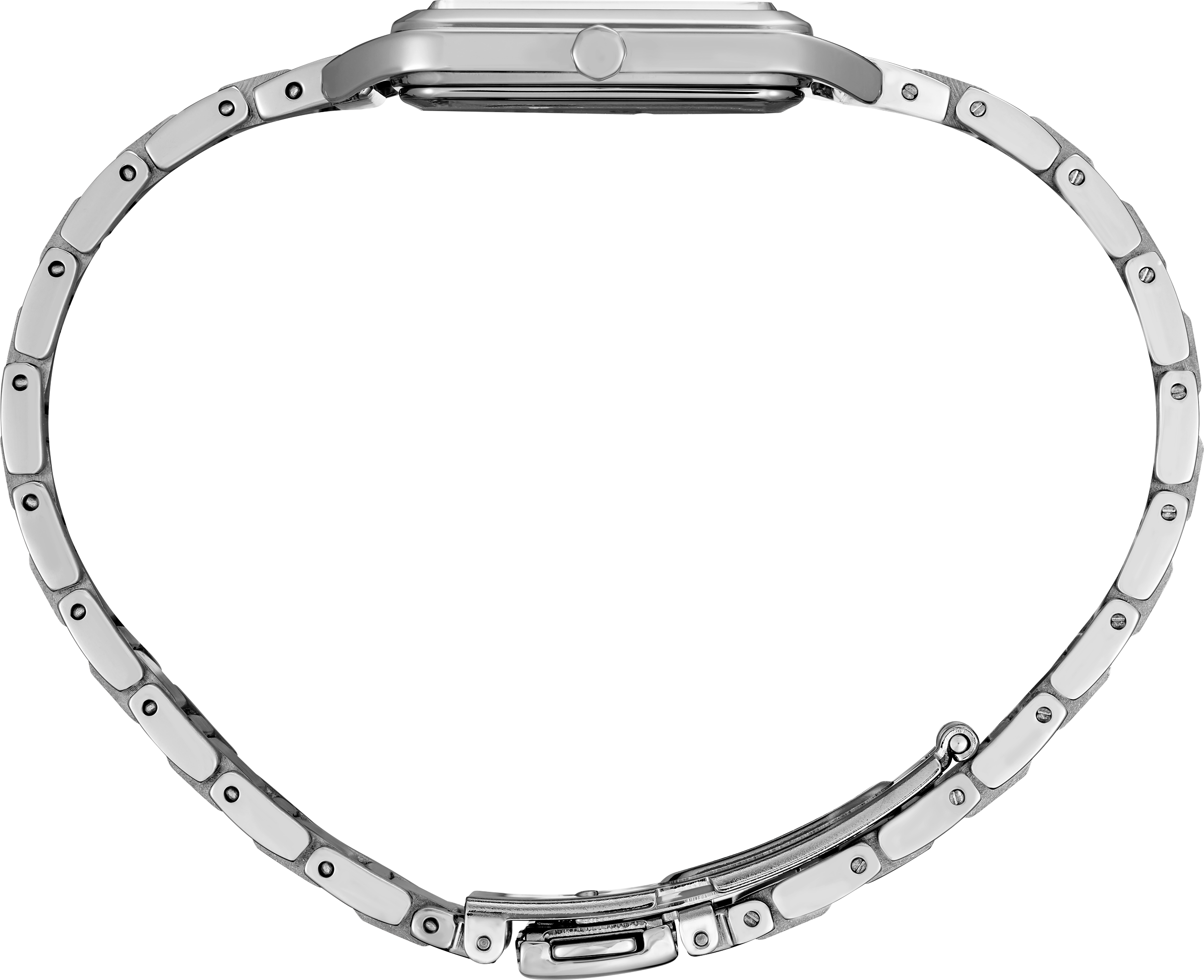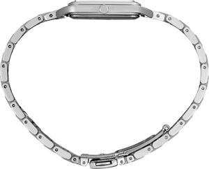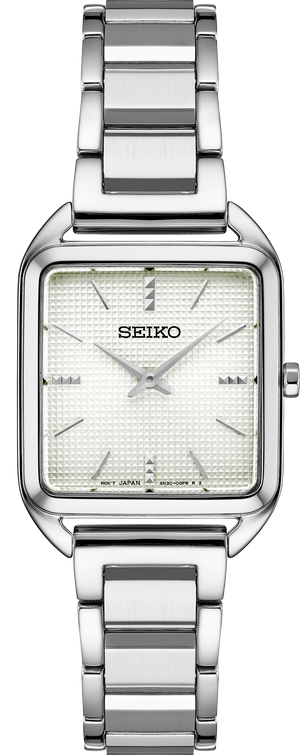 From the Essentials Collection. With a fresh square case design, this light and slim watch is proportioned for a perfect fit. The white die-stamped grid pattern dial and subtly textured markers add a hint of sophisticated luxury. Crafted of stainless steel with tri-fold push button release clasp. 5 bar, 50M Water Resistant<